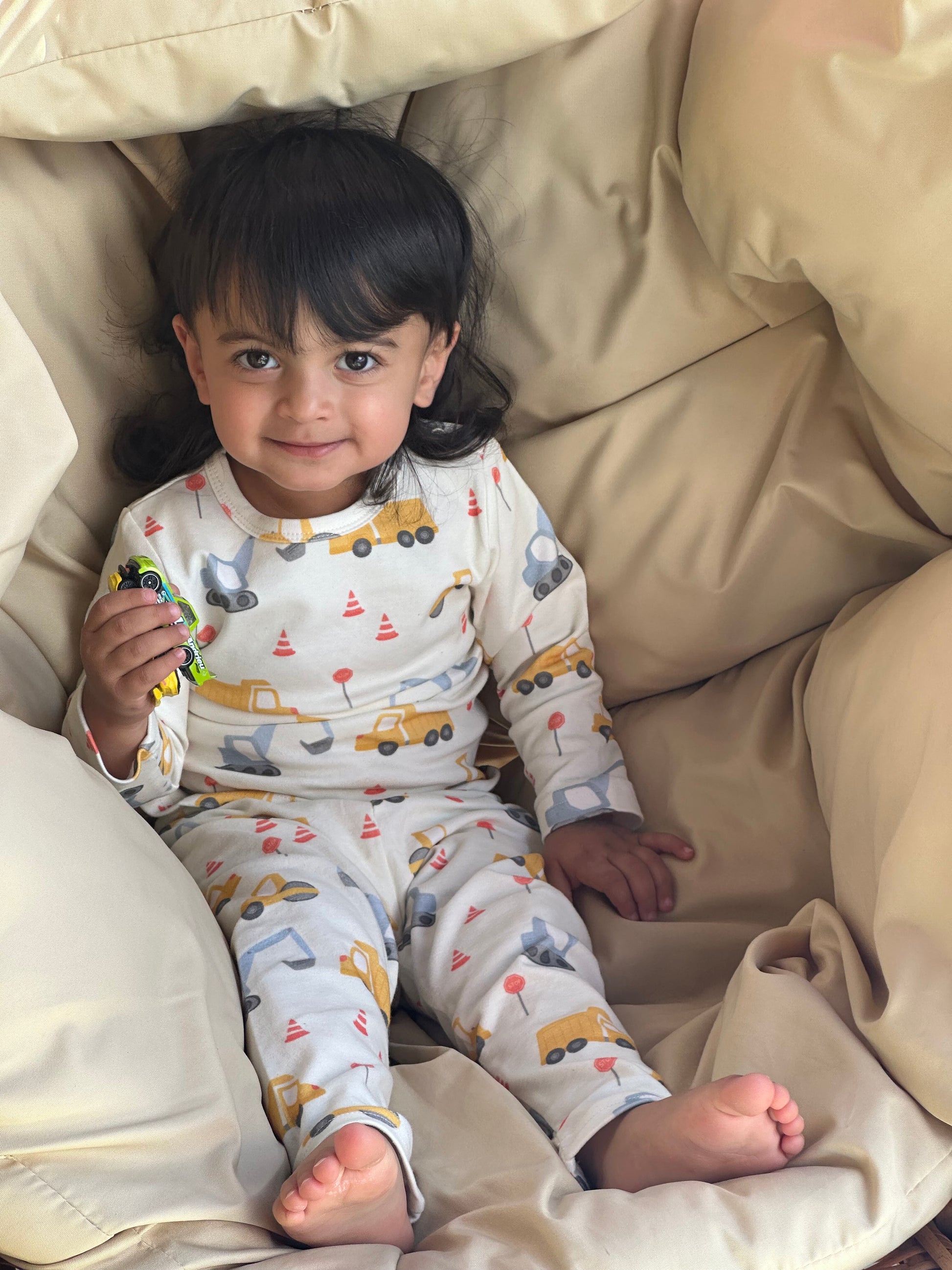 Bring the excitement of the worksite to your little one’s wardrobe with our Under Construction Two-Piece Set. This exclusive Burbaby print features bright yellow dump trucks, excavators, and road signs, perfect for little ones who love big machines.