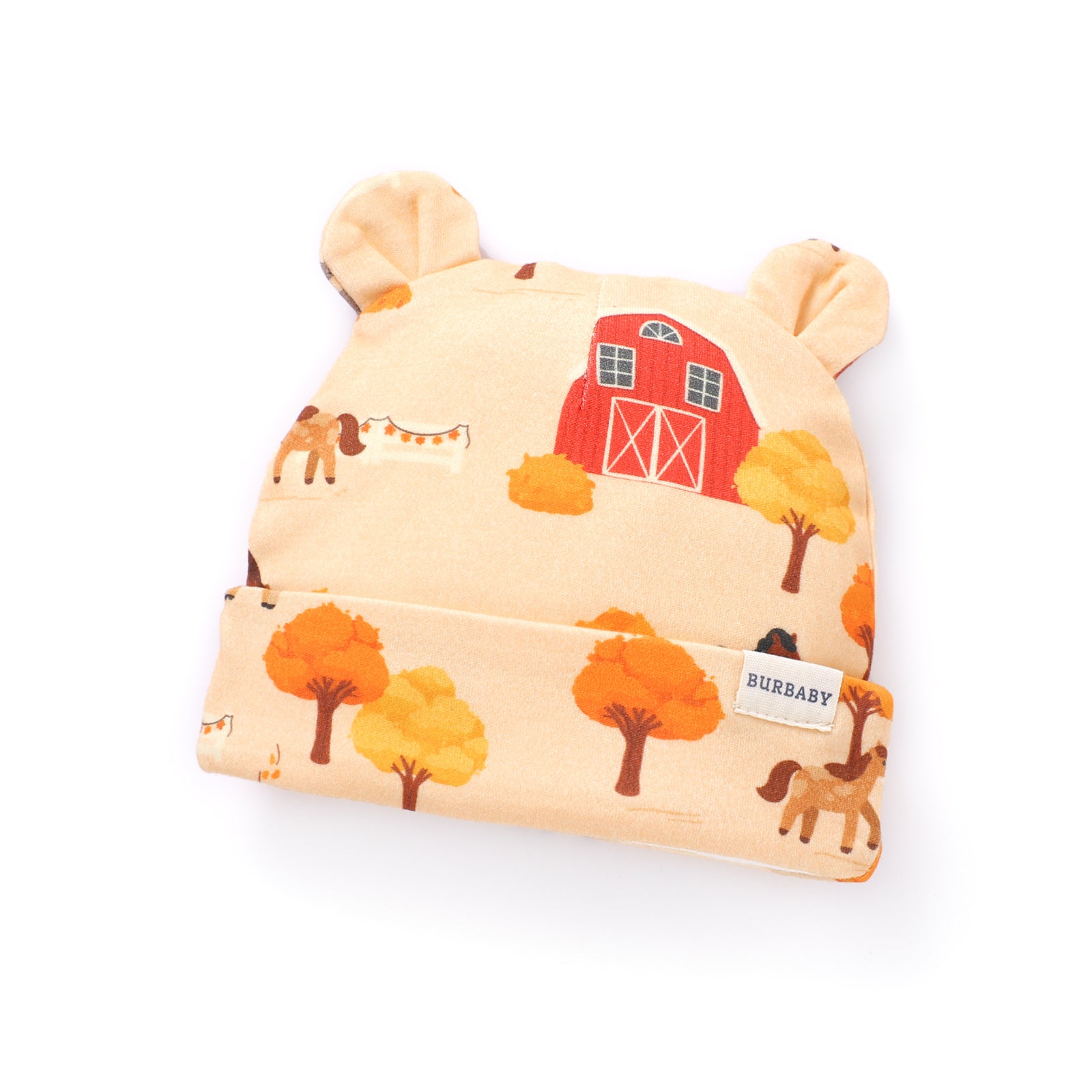 Top off your little one’s fall look with our Autumn Farm Bear Beanie Hat, featuring our exclusive farmyard print with barns, animals, and golden trees.